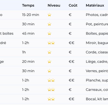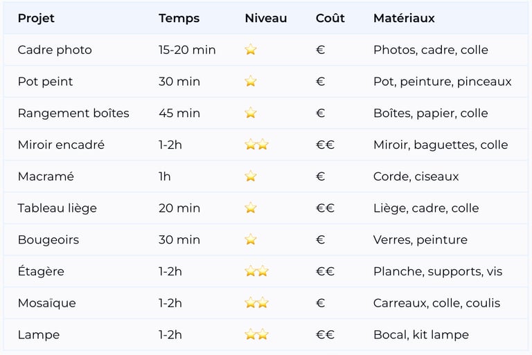 Commencez par le cadre photo personnalisé (15 min, aucun outil, résultat garanti) ou le pot peint (30 min, juste besoin de peinture).